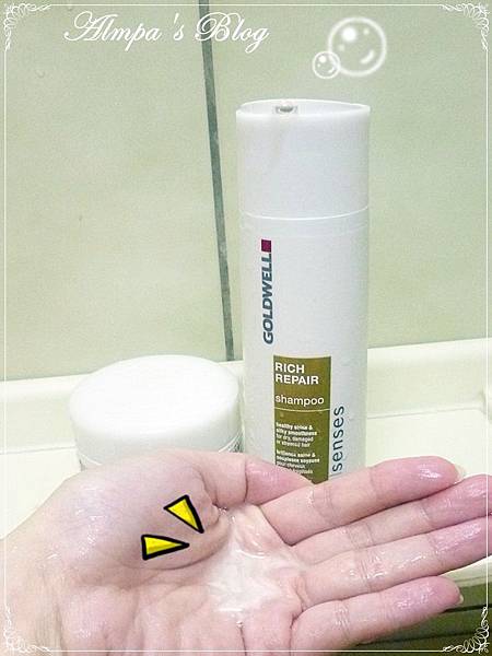 GOLDWELL水感洗髮精,閃耀著珍珠光澤的淡黃色系~加點水搓揉起泡後就往濕髮上招呼囉~!