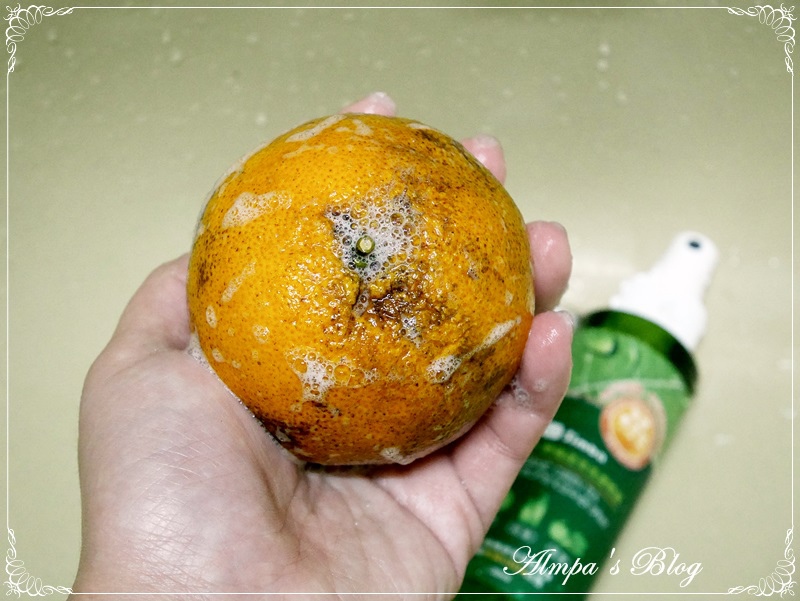 噴一下小獅王辛巴奶瓶蔬果洗潔噴霧,灑一點水,搓揉出泡泡,輕柔的搓洗外果皮。