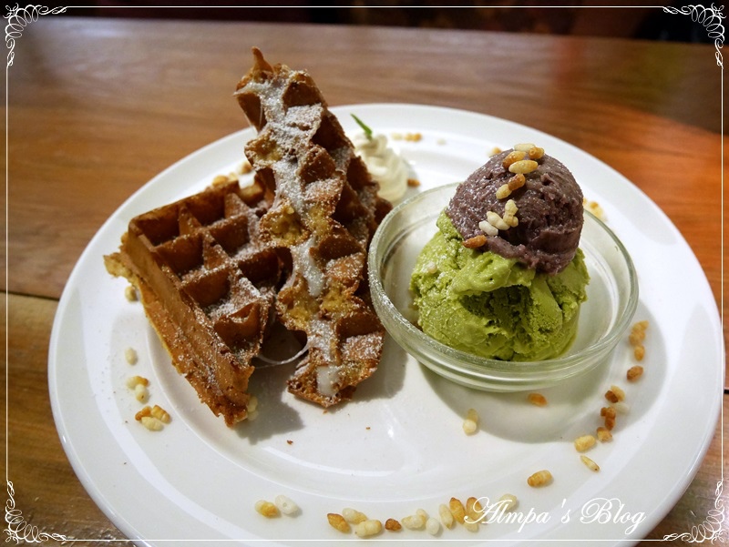 份量上來說,就是塊斜切的格子鬆餅;看似不大,吃完也有飽足感;滿口的麻糬讓人讚賞之餘,鬆餅組織顯得空虛,