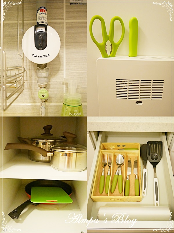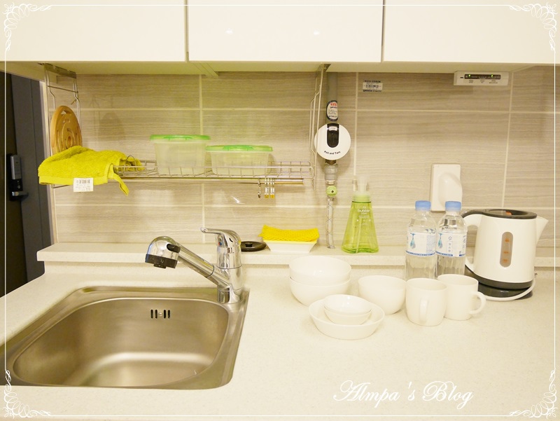 麻雀雖小,五臟俱全的流理台;包含了櫥櫃、抽油煙機、瓦斯爐、電茶壺、洗衣機。