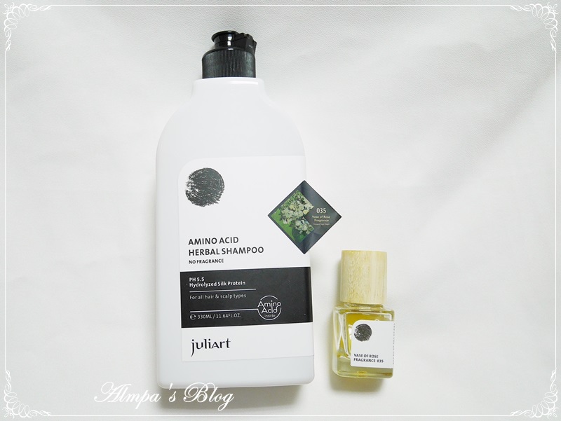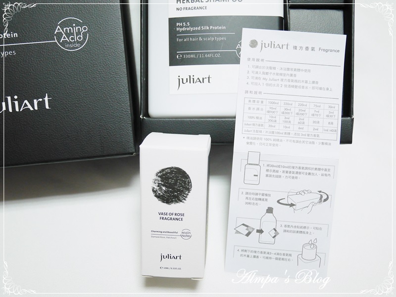 在My Juliart 胺基酸健康洗髮精中倒入適量複方香氛,搖晃均勻,就這麼簡單完成了,專屬於我的瓶中玫瑰。