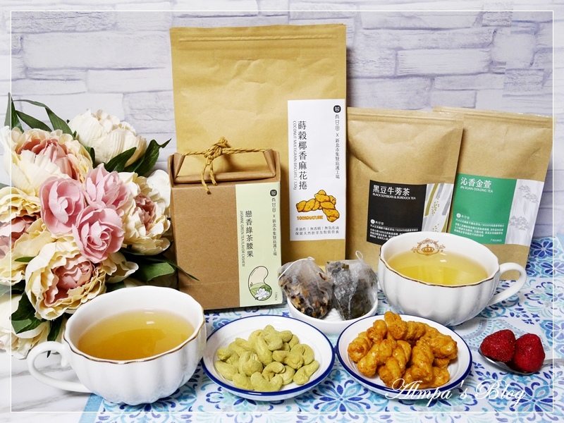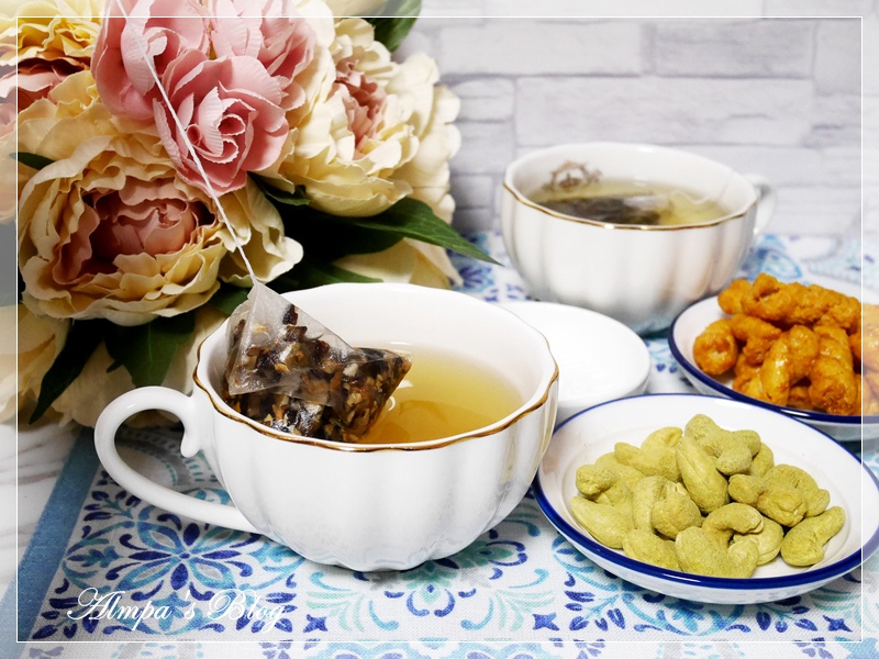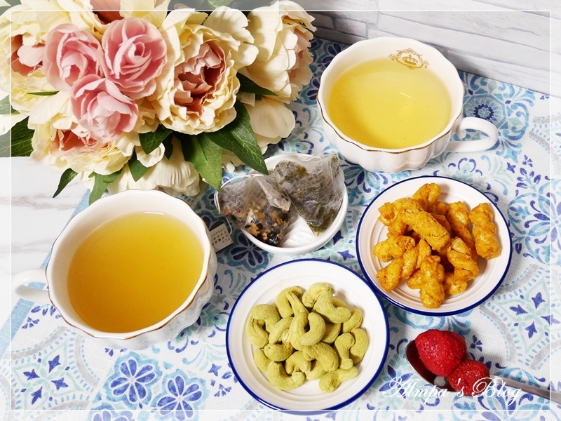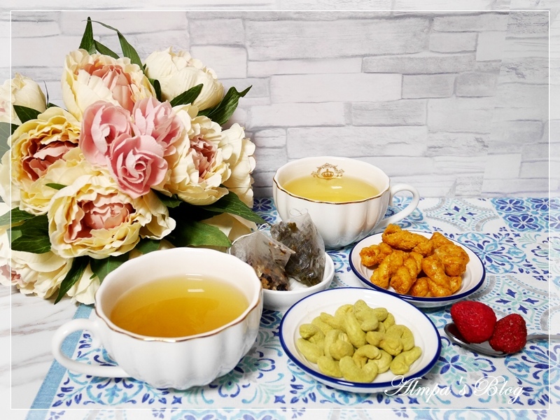 一杯有機沁香金萱、一杯有機黑豆牛蒡茶,加上戀香綠茶腰果和蒔榖椰香麻花捲~